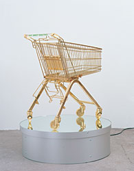 Стоит ли удивляться, что главным экспонатом выставки оказалась тележка для продуктов, представленная во всех видах. Золотая модель крутилась на подиуме при входе, словно выставочный экземпляр дорогого авто. Другая, трехметровая была полностью — от ручки до колесиков — упакована знаменитым Кристо. Художник положил жизнь, доказывая, что придать товарный вид можно чему угодно — от мостов и островов до рейхстага, надо лишь подобрать подходящую упаковку.