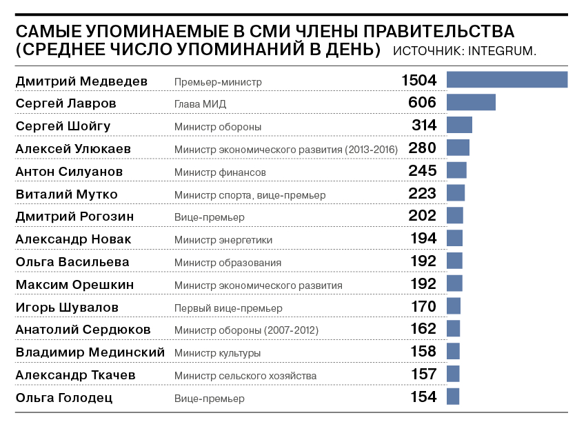 Самым упоминаемым в СМИ членом правительства все шесть лет был Дмитрий Медведев. На каждый день в должности премьера пришлось в среднем около 1,5 тыс. упоминаний его в СМИ. Одним из самых малоупоминаемых в СМИ стал Андрей Белоусов — глава Минэкономразвития в 2012–2013 годах. В среднем на каждый его день в должности пришлось 39 упоминаний.