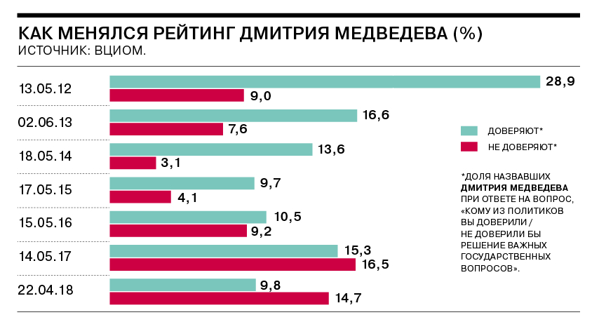 Участники опросов ВЦИОМа стали почти в три раза реже называть Дмитрия Медведева среди тех, кому они доверили бы решение важных государственных вопросов. По данным на 22 апреля 2018 года, доверяют Дмитрию Медведеву 9,8% респондентов.