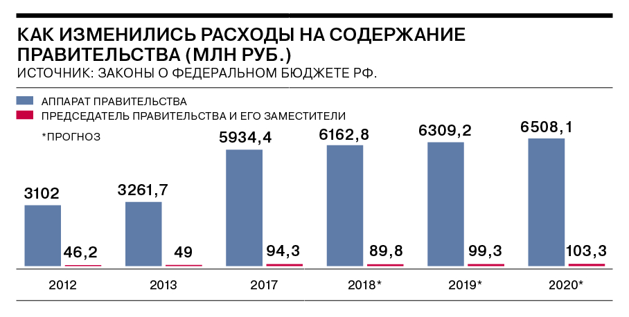 Расходы федерального бюджета на содержание аппарата правительства выросли почти в два раза — с 3,1 млрд руб. в 2012 году до 6,16 млрд руб. в 2018-м. Расходы на премьера и его заместителей также увеличились почти вдвое — до 89,8 млн руб., запланированных в 2018 году.