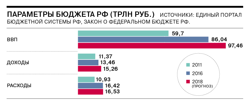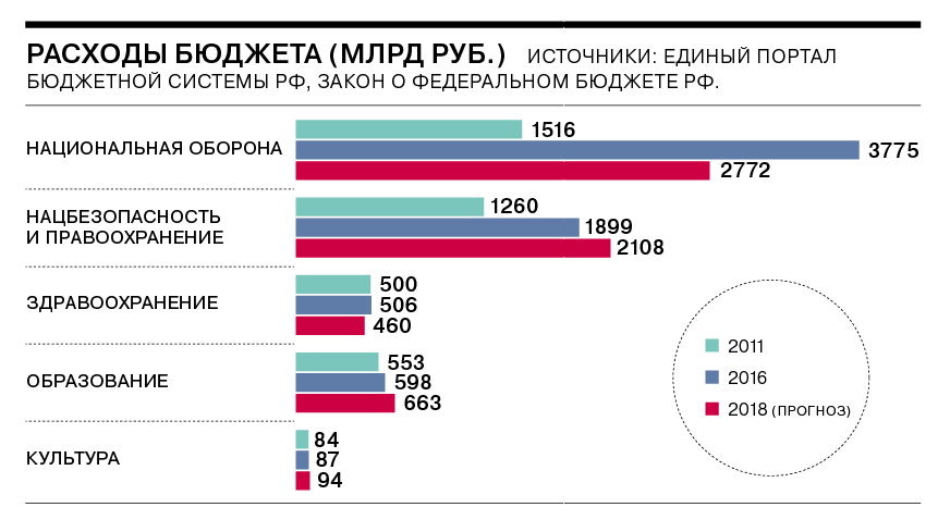 Расходы на национальную оборону выросли по сравнению с 2011 годом почти в два раза — до 2,8 трлн руб. На национальную безопасность и правоохранительную деятельность — в 1,7 раза, до 2,1 трлн руб. в 2018 году. Расходы на здравоохранение, согласно бюджетному плану, сократятся за тот же период на 8% — до 460 млрд руб., на образование — вырастут почти на 20% — до 663 млрд руб.