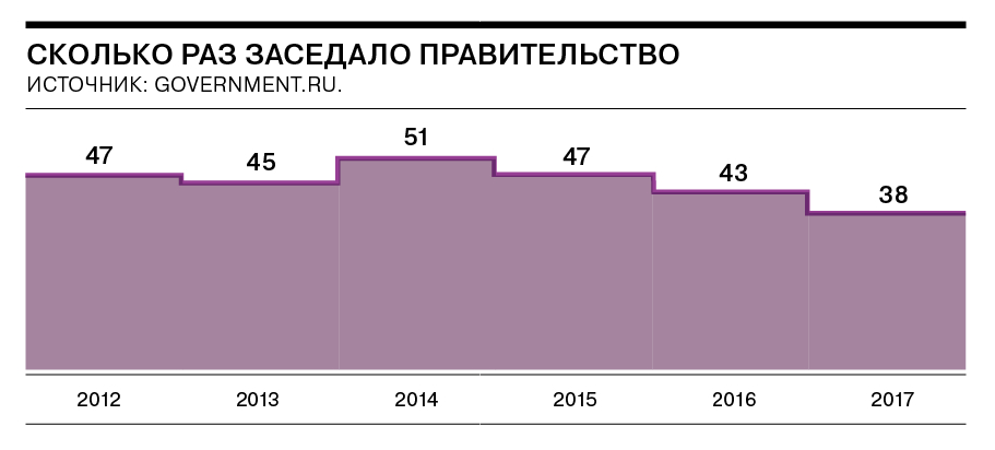 По сравнению с 2012 годом, количество заседаний правительства сократилось на 23% — до 38 в 2017 году. Чаще всего члены правительства заседали в 2014 году — 51 раз. Всего за шесть лет работы правительство приняло 25,7 тыс. постановлений и распоряжений.