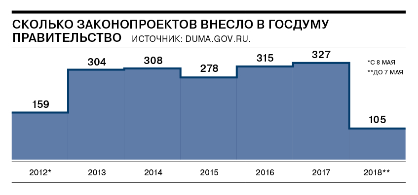 С 8 мая 2012 года по 7 мая 2018 года федеральное правительство внесло в Госдуму 1796 законопроектов. Пик активности пришелся на 2017 год, когда было внесено 327 законопроектов.