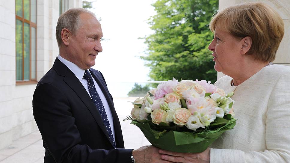 Владимир Путин встречал Ангелу Меркель на крыльце резиденции «Бочаров ручей» с букетом. Пока канцлер выходила из машины, российский лидер успел оглядеть цветы — обернутые в сочную зеленую бумагу чайные розы, розовые эустомы и белые фрезии. Когда Меркель поднялась по лестнице, Путин пожал ей руку и протянул букет. Немецкий политик улыбнулась, поблагодарила и направилась к дверям.