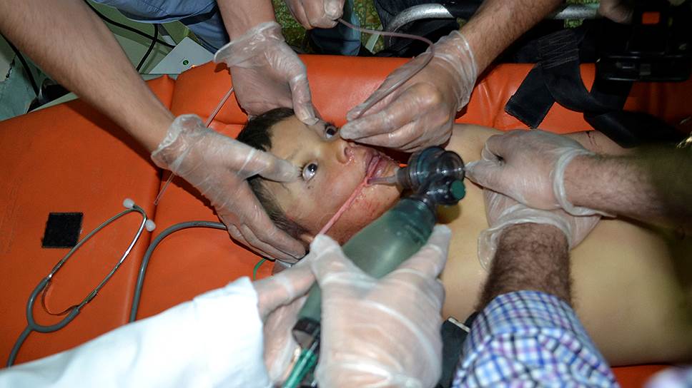 Во время другой атаки сирийская армия якобы сбросила «химическую бомбу» на балкон жилого здания, что стало причиной гибели 49 человек, включая 11 детей, «кожа которых посинела».
