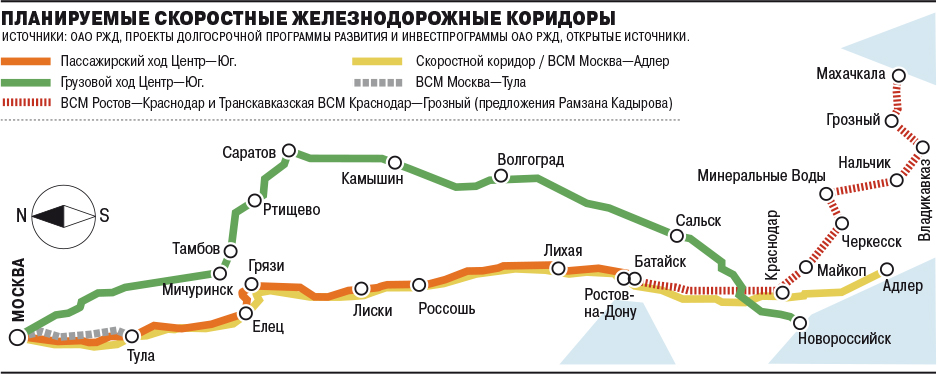 Также предусмотрено строительство ВСМ Москва—Тула длиной 194 км и стоимостью 363 млрд руб. как первого элемента будущей южной ВСМ. Ответвлений на Грозный и Махачкалу пока в планах нет. Зато южнее Ростова у ОАО РЖД запланировано огромное количество работ, связанных с организацией грузопотоков: майские указы президента требуют обеспечить к 2024 году пропуск 131 млн тонн на порты Азово-Черноморского бассейна, в инвестпрограмме предусмотрено строительство обхода Краснодара. Пуск здесь скоростного сообщения может войти в противоречие с планами по развитию грузового: как рассказывал источник, близкий к ОАО РЖД, появление одного скоростного пассажирского поезда в среднем влечет снятие четырех грузовых.