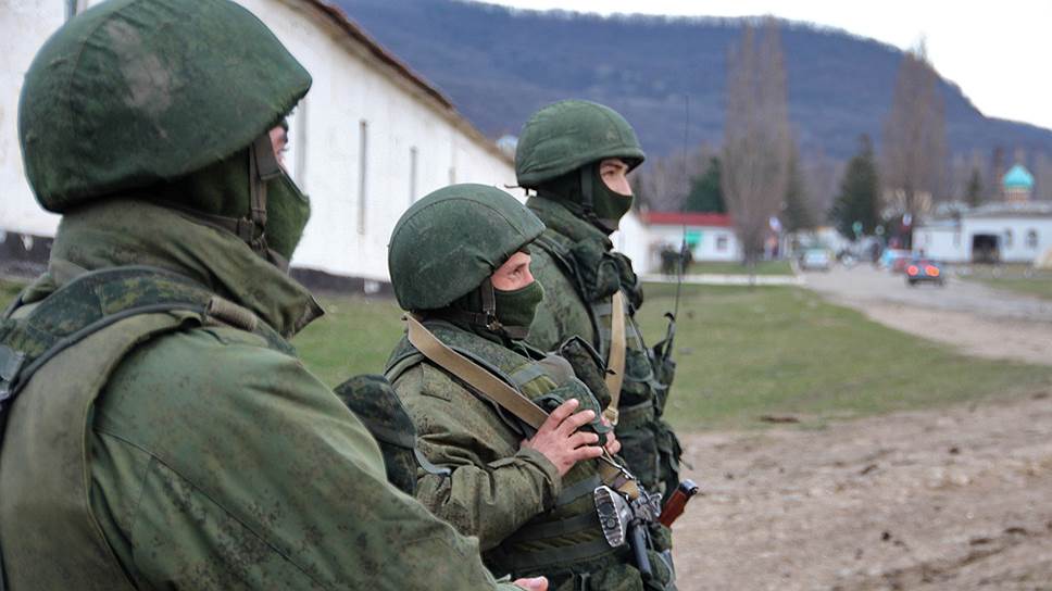 Военнослужащие без знаков различия возле военной базы в крымском селе Перевальное (2014)