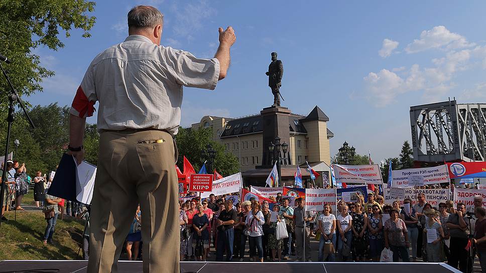 Митинг открыл заместитель председателя федерации профсоюзов Новосибирской области Василий Москвин. Профсоюзный лидер отметил, что свыше 70 региональных парламентов поддержали предложенную правительством России пенсионную реформу. «Мы с вами выбирали депутатов и видим, как они защищают наши права. Нам можно надеяться только на себя»,— сказал господин Москвин, предложив проанализировать работу Пенсионного фонда РФ. «Есть много вопросов и по части особняков, и по части заработных плат руководителей»,— уточнил он.