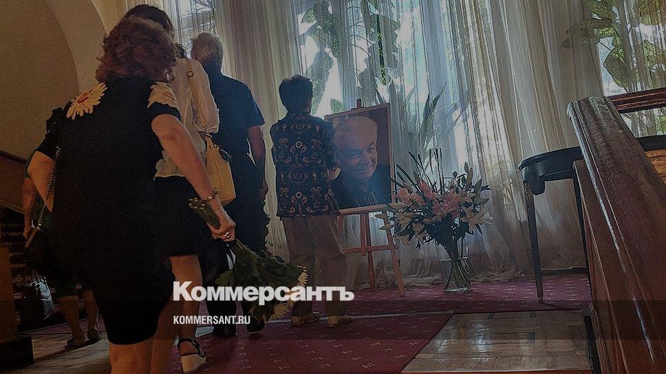 Как сообщает корреспондент “Ъ”, люди проходили через левый вход в актовый зал ЦДЛ и вставали в очередь, затем поднимались на сцену, где установлен гроб. Вокруг были возложены алые розы, стояли венки. Рядом с гробом находилась семья и близкие друзья писателя.