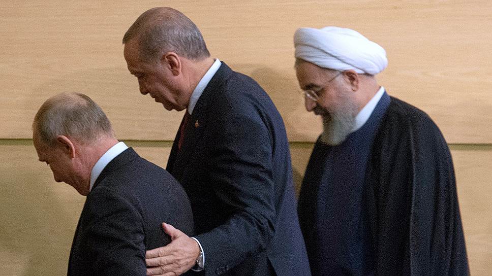 Зато организаторы показали в прямом эфире выступления всех трех лидеров. Ну и ладно, что речь господина Роухани переводили на русский, а речь Владимира Путина на русском не дали вообще — просто выключили звук, как и во время речи Реджепа Тайипа Эрдогана. Никакой катастрофы в этом, впрочем, не было: все три выступления, как позже выяснилось, были полны общих слов. Президент Роухани требовал положить конец войне, дать Сирии право на самоопределение, и «мы все вместе боремся за мир во всем мире», а «война ради войны — это дело террористов в Идлибе», а «США и сионистский режим — пособники террористов в регионе».