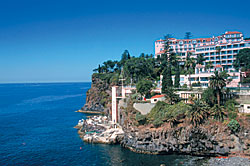 Если бы аэропорт был на плато, спускаться вниз к городу Фуншал пришлось бы по серпантинам, под водопадами, падающими прямо на шоссе, через кедровые леса, где по горному хребту в сторону уходит вдруг дорога. Остановиться и выйти из машины на такой дороге нельзя: вместо тротуара — пропасть. В конце дороги — дом на одинокой скале. Ниже — эвкалиптовые рощи и прорубленные в скалах левады, по которым принято гулять с альпенштоком в руке. Еще ниже — виноградники для приготовления мадеры. Еще ниже — банановые плантации, причем бананы мельче, слаще африканских и используются как гарнир к рыбе. Жареные, разумеется.