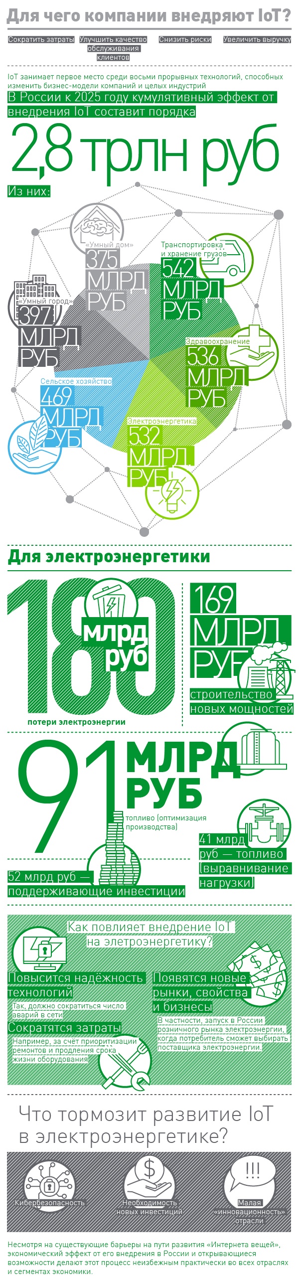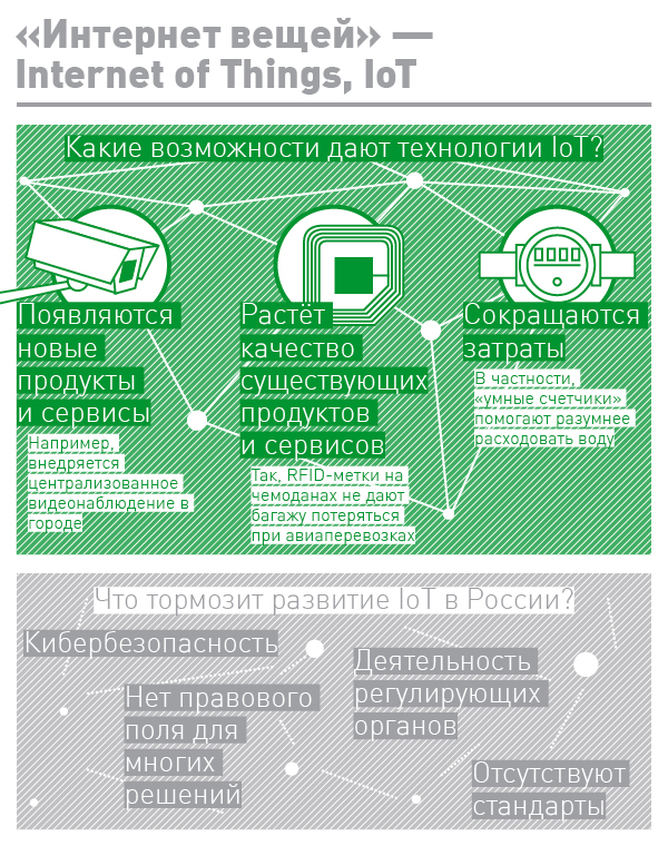 «Интернет вещей» (Internet of Things, IoT) уже становится реальностью. Ёмкость мирового рынка IoT-решений к 2020 году может превысить $1,2 трлн, а количество «подключенных» устройств к этому времени составит от 20 до 50 млрд штук. Драйверами развития IoT будут домохозяйства, малый и средний бизнес. Зачем бизнесу нужна технология IoT?