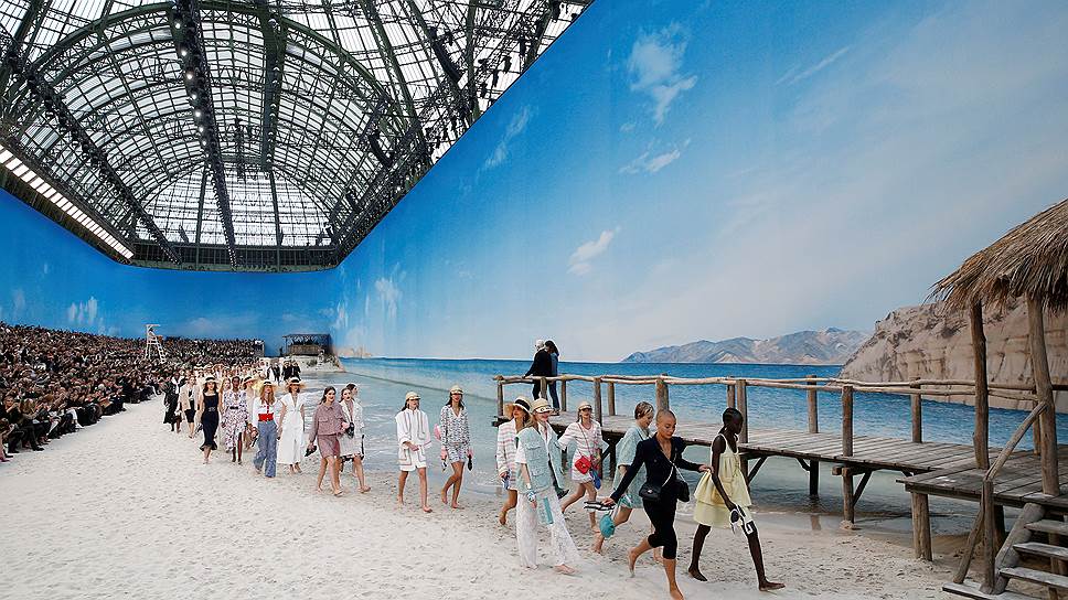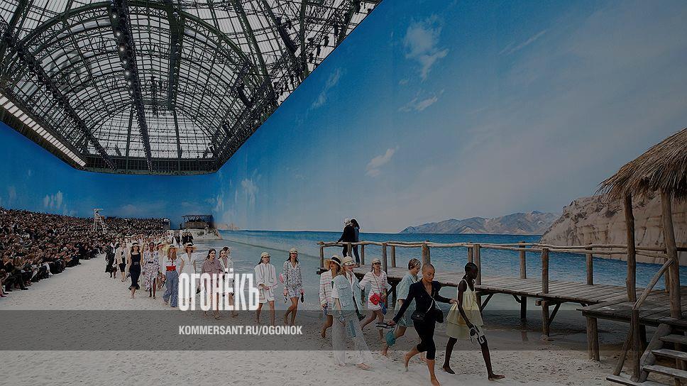 В начале октября модный дом Chanel принес лето, море и песчаный пляж прямо в Большой дворец Парижа. На показе коллекции весна-лето-2019 модели ходили босиком по кромке настоящего прибоя с туфлями в руках. Сколько стоило создание реальных (!) бирюзовых волн в гигантском павильоне, сколько тонн белоснежного песка привезли с тропических островов, модный дом держит в секрете. Хотя секрета на самом деле нет — это все очень дорого. И рукотворное чудо должно убеждать в одном: Chanel даже самая невероятная задумка по плечу. Ну что ж, убеждает: модный дом представил шикарный морской курорт в непосредственной близости от Эйфелевой башни, и море шумело, и чайки кричали, а за моделями в соломенных шляпах и темных очках с настоящего деревянного пирса следили спасатели. Ну и еще — креативный директор Chanel великий Карл Лагерфельд.