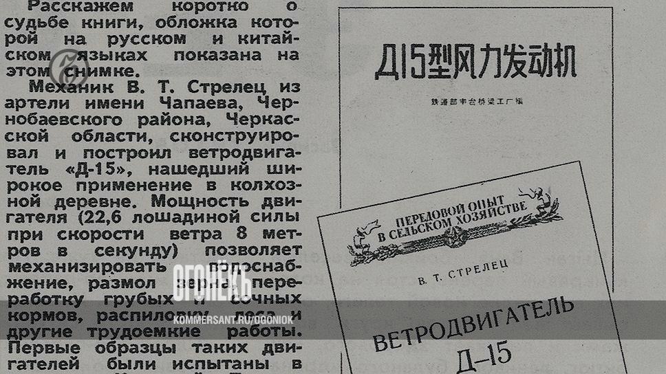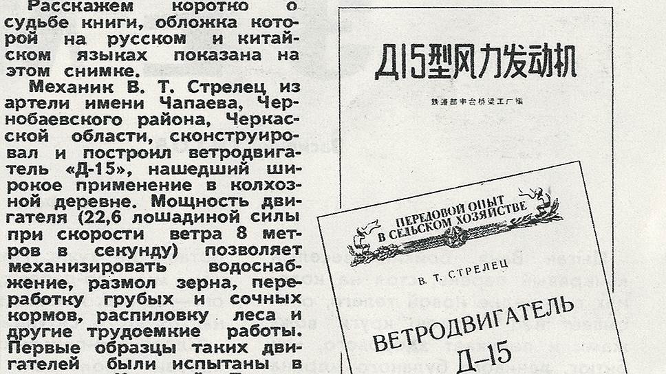 60 лет назад «Огонек» писал о колхозном механике Владимире Стрельце из Чернобаевского района Черкасской области. Он сконструировал и построил ветродвигатель. «Ветродвигатель нашел широкое применение в колхозной деревне,— сообщал журнал.— Мощность двигателя (22,6 лошадиной силы при скорости ветра 8 метров в секунду) позволяет механизировать водоснабжение, размол зерна, переработку грубых и сочных кормов, распиловку леса и другие трудоемкие работы. Первые образцы таких двигателей были испытаны в колхозах Киевской, Полтавской, Кировоградской и Черкасской областей». Харьковская опытная станция механизации сельского хозяйства рекомендовала внедрение ветродвигателей Стрельца. В Союзе большим тиражом вышла книга Владимира Стрельца — подробные с чертежи, описание устройства ветродвигателя и способов его изготовления. Опыт механика начал распространяться в Китае. «На Пекинском мостостроительном заводе "Фунтайтяолян" под руководством инженера Дун Тянлина по материалам книги В.Т. Стрельца был изготовлен первый китайский образец ветродвигателя "Д-15",— рассказывал "Огонек".— Весть о новой машине быстро разнеслась по Китайской Народной Республике. Из различных провинций, уездов, от кооперативов, от отдельных тружеников деревни посыпались запросы. Многие лично приезжали на завод посмотреть ветросиловую установку. А совсем недавно книга колхозного механика В.Т. Стрельца вышла в свет в Пекине на китайском языке». Труженики Китая передавали советскому умельцу сердечную благодарность.