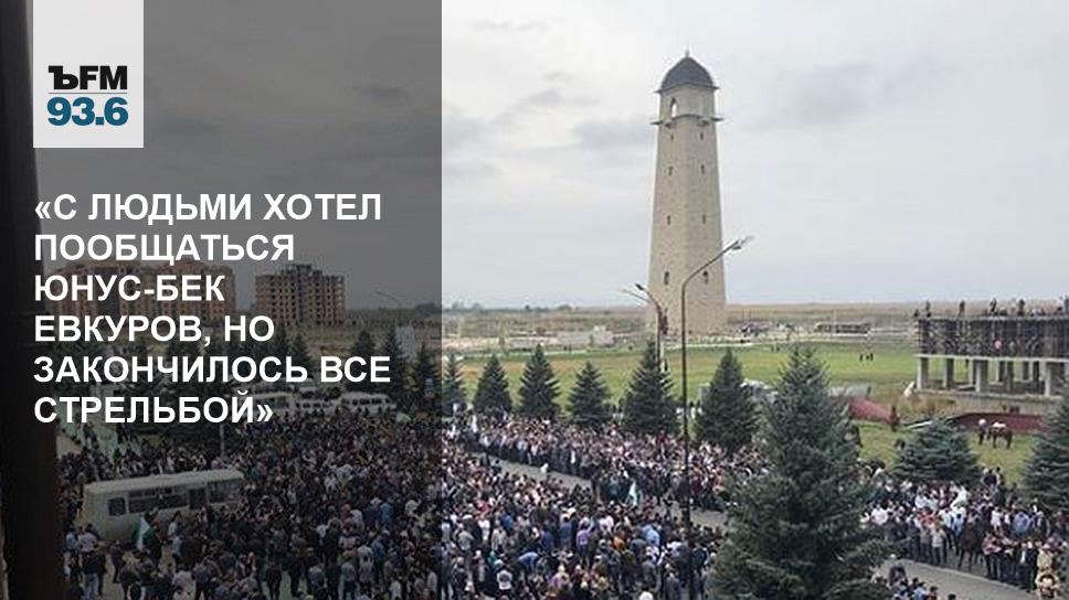 — На это требование они ничего не отвечают. Сегодня с ними хотел выйти пообщаться Юнус-Бек Евкуров, но закончилось все стрельбой. Господин Евкуров появился, попытался пообщаться с людьми, но в толпе начались какие-то волнения. Очевидцы говорят, что кто-то якобы бросил пластиковую бутылку — я сама этого не видела, потому что наблюдала сверху. Зато я точно видела, как после этого охрана начала распихивать протестующих и начала стрелять в воздух. Но какой-то большой паники это не вызвало. Тем не менее, возник такой момент, когда могла произойти эскалация конфликта, но старейшины всех успокоили. Потом началась молитва, и как-то эти буйные настроения стихли, хотя, вот повторюсь, в какой-то момент было довольно страшно, потому что прямо автоматные очереди звучали.