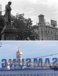 | Первая крышная реклама Coca-Cola была на Пушкинской площади. Говорят, ее перенесли оттуда, поскольку она по размерам уступала крышной рекламе Pepsi, которая до сих пор находится в том районе |