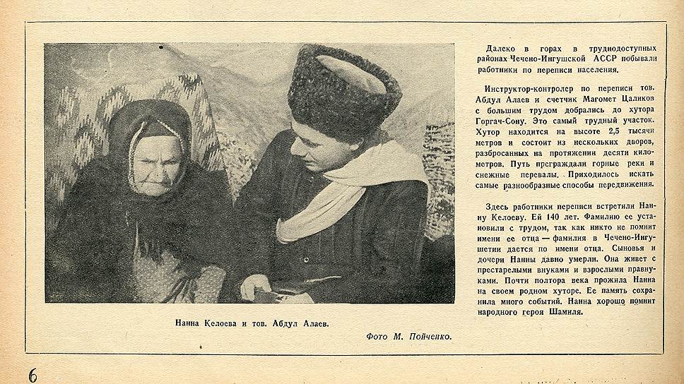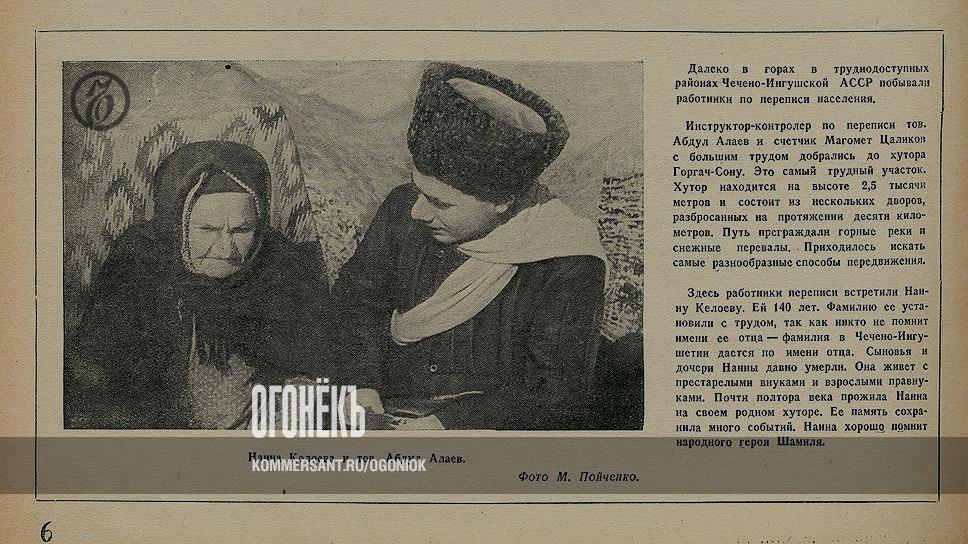 «Значение предстоящей переписи исключительно велико,— писал "Огонек".— В ее итогах должны найти полное отражение всемирно-исторические победы социализма, достигнутые под мудрым руководством партии Ленина — Сталина». Для чего глава Советского правительства товарищ В.М. Молотов «участвовал в разработке научной программы предстоящей переписи», так как «перепись должна была показать миру нового советского человека, хозяина своей земли». В числе прочих «хозяев» была найдена, например, Нанна Келоева — 140-летняя жительница хутора Горгач-Сону, что на высоте 2,5 тысячи метров в Чечено-Ингушской АССР. Старожилы долго не могли вспомнить имени ее отца, зато сама Нанна, как писал «Огонек», «хорошо помнила народного героя Шамиля» (1797–1871.— «О»).
