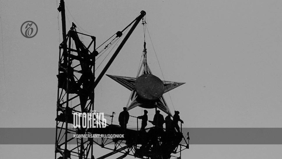 В 1935 году советское правительство приступило к замене двуглавых орлов на рубиновые звезды в Московском Кремле. На фото — звезда занимает место на Спасской башне: примечательно, что в 1654 году, при царе Алексее Михайловиче, первый двуглавый орел тоже вознесся над Спасской башней. Пятиконечные символы остаются с нами до сих пор, но сколько продержатся, не известно: стекольный завод «Красный май» в Вышнем Волочке, в свое время изготовивший, а потом обслуживавший звезды, ныне закрыт. Будут ли за них биться другие мастера или кто-то отольет более долговечных железных орлов, вопрос не столько технический, сколько политический, ведь наши символы до сих пор враждуют с российским государством. Как это происходит, читайте в теме номера «Перелетные символы».