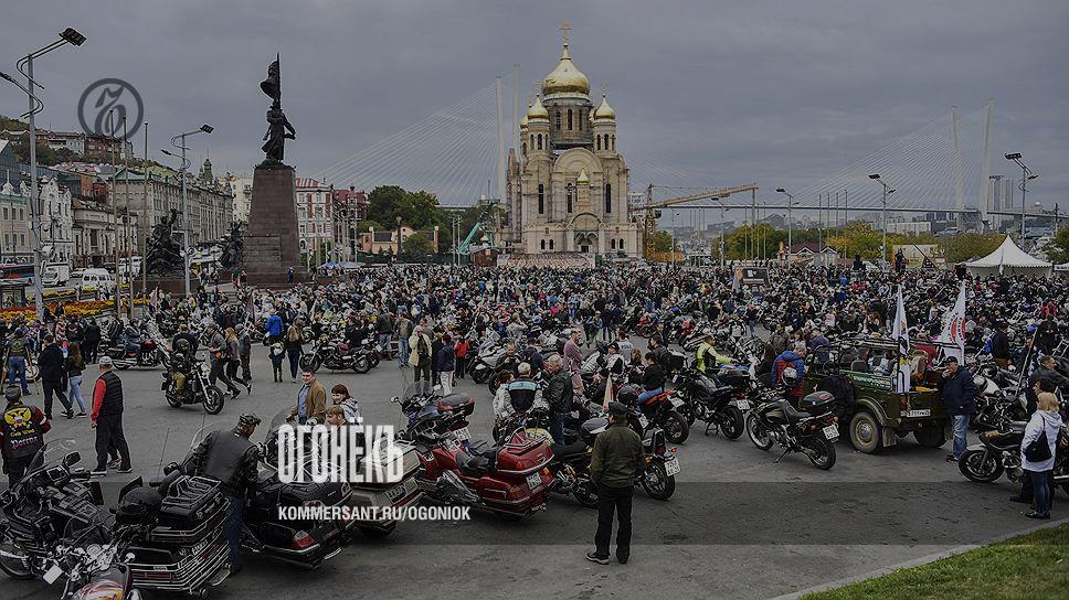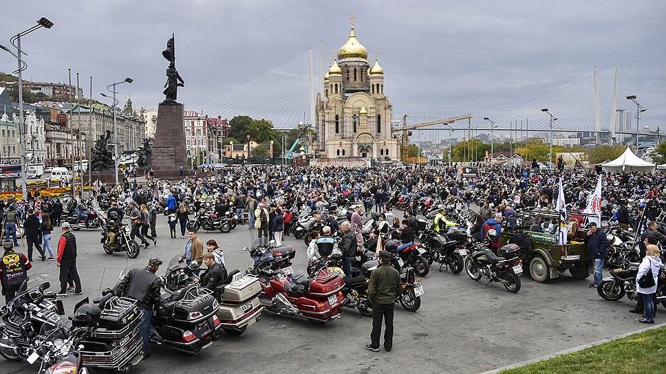 Неожиданно ставшее в Приморье крупным событием закрытие мотосезона (на фото — центральная площадь Владивостока у Спасо-Преображенского храма) в нынешних декорациях воспринимается символически: известно ведь, что врио губернатора еще и байкер