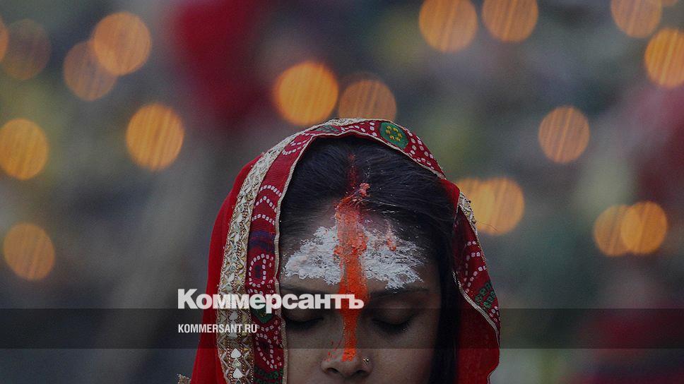 Катманду, Непал. Верующая молится во время захода солнца на берегу реки Багмати во время праздника Чхатх