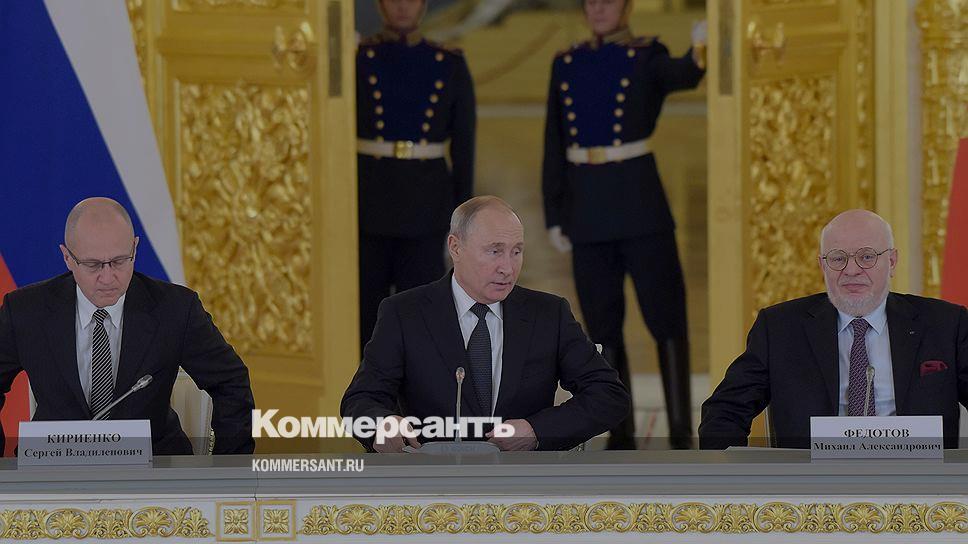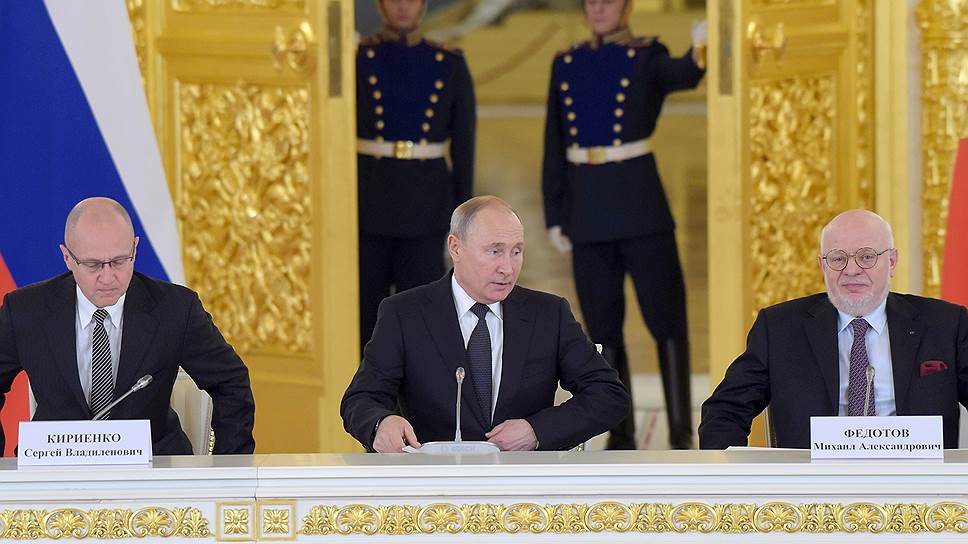 Слева направо: первый заместитель руководителя администрации президента Сергей Кириенко, президент России Владимир Путин и председатель Совета при президенте России по развитию гражданского общества и правам человека Михаил Федотов
