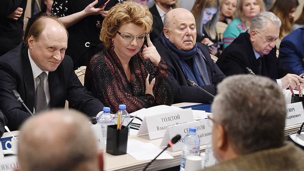 Советник президента Владимир Толстой (слева) готов обсуждать концепцию закона «О культуре» в Госдуме с общественным советом во главе с председателем думского комитета по культуре Еленой Ямпольской (в центре)
