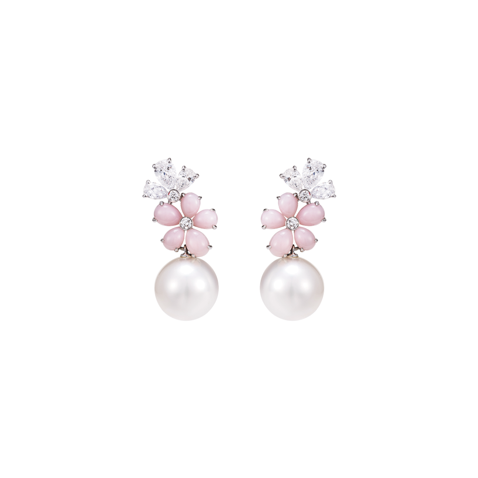 Серьги Flower, белое золото, розовый опалы, жемчуг, бриллианты