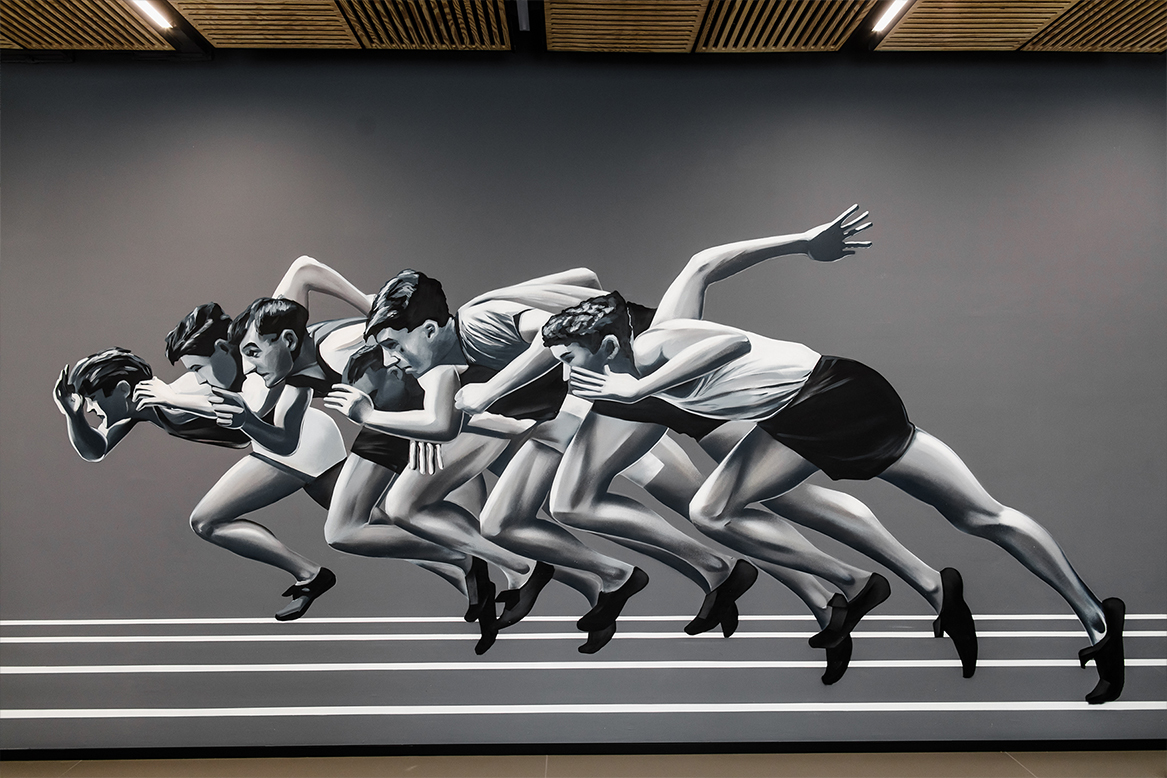 Я большой поклонник такого стиля искусства, как соцреализм, и мои любимые художники в этом жанре — Александр Дейнека и Борис Тальберг. Поэтому я нашла живописца, который бы мог в подобном стиле написать настенные панно, воспевающие красоту человеческого тела и духа. Им стал художник из Пермского края, которого я нашла в интернете, Алексей Щигалёв. Его рисунки на стенах #SlimFitClub стали своеобразной фишкой и узнаваемой чертой студии.
