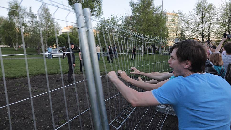 По оценкам корреспондента “Ъ-Урал”, в акции протеста приняли участие порядка 1,5–2 тыс. человек. Изнутри забор охраняли сотрудники ЧОП «РМК Безопасность», а также сотрудники Росгвардии и полиции. Активисты держали в руках плакаты с надписями «За сквер!», «Сквер наш!» и цитатами классиков о церкви. Сначала активисты водили хоровод вокруг забора, исполняя песню «День Победы», играли на балалайке, а затем стали стучать по забору ключами. Часть собравшихся хлопала в ладоши и кричала «Позор!», «Россия будет зеленой!» и «Оккупанты!». В результате им удалось свалить ограждение, они зашли на территорию сквера и стали по нему гулять.