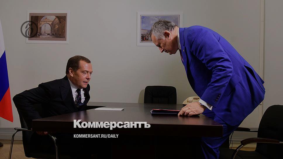 Председатель Правительства России Дмитрий Медведев (слева) и губернатор Ленинградской области Александр Дрозденко (справа) во время встречи