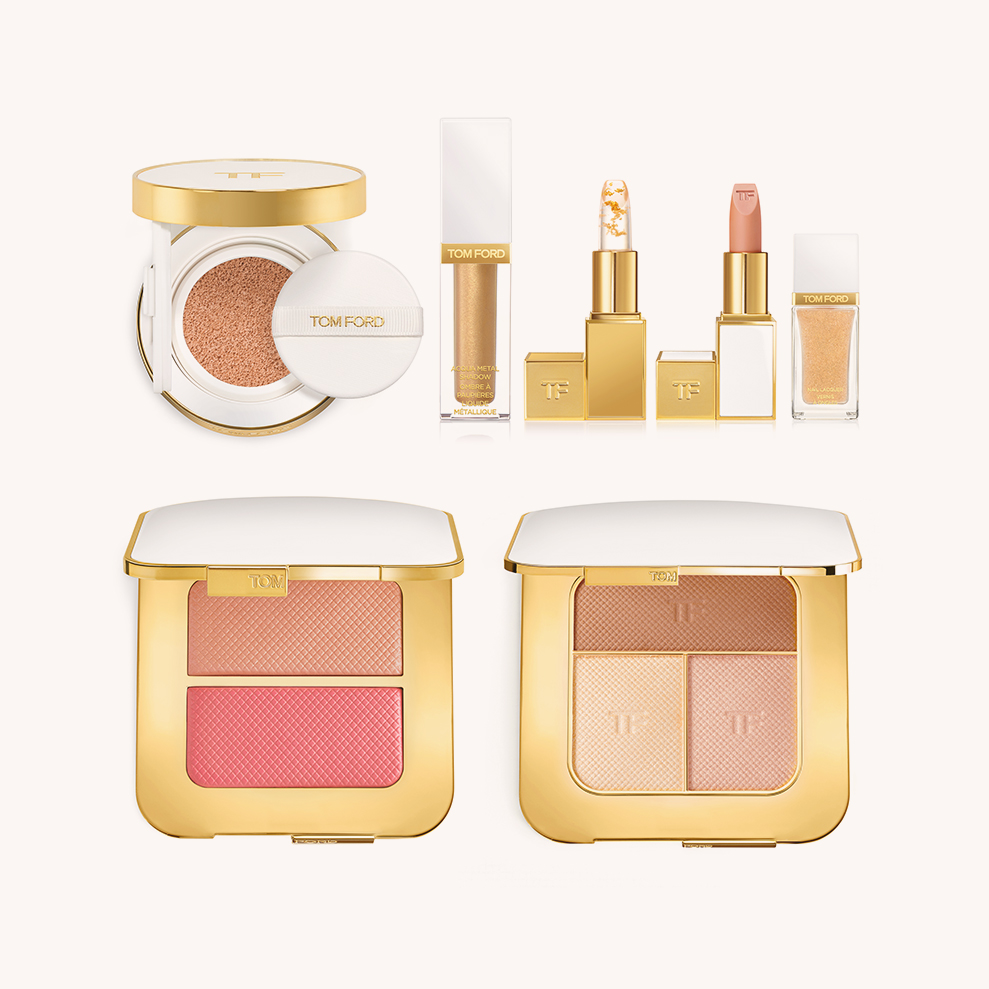 В летнюю коллекцию Tom Ford Soleil 2019 вошли средства макияжа с частицами 24-каратного золота и увлажняющим эффектом: тинты для губ, бронзеры, тональное средство-кушон, жидкие тени для век и кондиционер для губ.