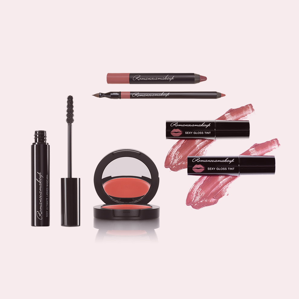 Летний макияж от Romanovamakeup – это кремовые румяна скульптурирующий крем для лица, блески для губ ягодных оттенков, карандаши для бровей и век, черная тушь.
