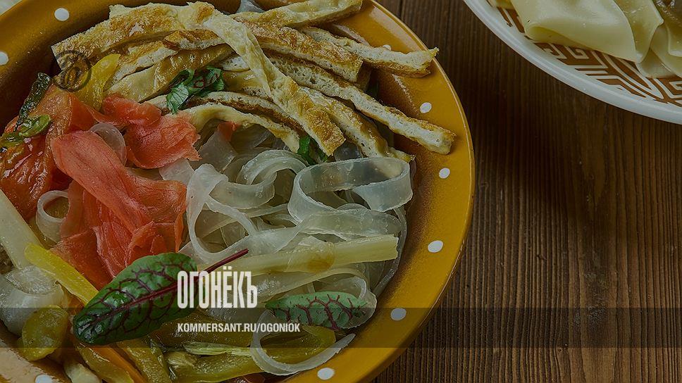Теперь кладите в пиалу лапшу — желтую, на нее белую — и заливайте заправкой. Блюдо может быть более или менее жидким — супом или даже основным блюдом. Можно и не перемешивать ингредиенты перед подачей, а положить отдельно — сначала две лапши, потом овощи, поверх них — острую заправку, залить все уксусной смесью и посыпать сверху луком. Соус, кроме, разумеется, зелени, можно приготовить заранее и хранить в холодильнике до того момента, когда вам снова очень захочется холодного супа.