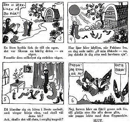 2 Первый комикс Туве Янссон был про гусениц. В 1929 году детская газета Lukentus заказала 15-летней Туве Янссон, начинающему иллюстратору, комикс, и она сочинила историю о приключениях семейной пары гусениц — Прикины и Фабиана. В финале гусеницы заводили ребенка, а потом превращались в бабочек. Школьный учитель биологии Янссон был очень расстроен.