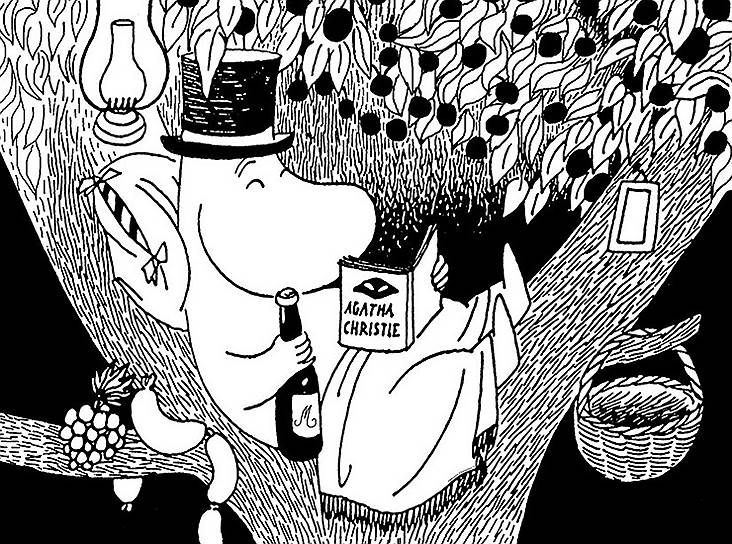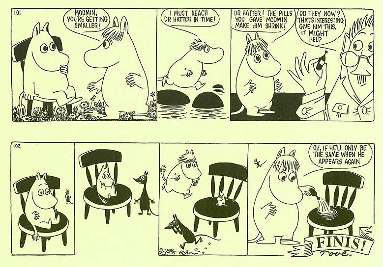 32 Однажды Туве Янссон пыталась убить Муми-тролля. Самый последний комикс про муми-троллей, отрисованный Янссон, заканчивался очень тревожно — психиатр диагностировал у Муми-тролля закомплексованность и давал ему таблетку, от которой тот начинал уменьшаться в размерах и постепенно превращался в лужицу. На последней картинке фрекен Снорк выливала в лужицу противоядие, но нигде не сообщалось, подействовало ли оно. Такой финал был придуман на тот случай, если редакция The Evening News не утвердит Ларса Янссона на роль нового художника и славные приключения муми-троллей в Англии на этом закончатся.