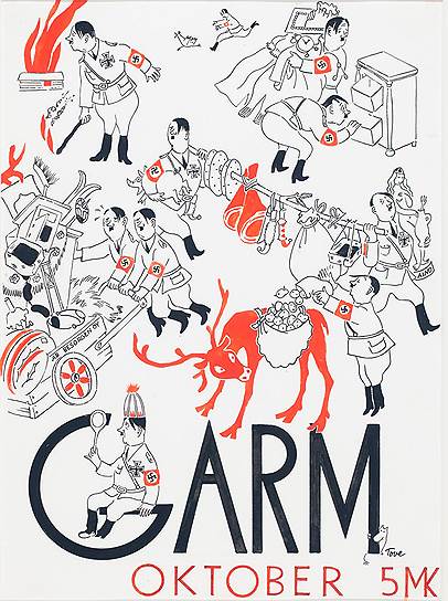 9 Публика впервые увидела муми-тролля рядом с нацистами. В 1944 году Туве Янссон наконец оказалась готова представить своего героя зрителям. К этому моменту она была успешным и востребованным иллюстратором — в 1941 году пресса назвала ее одним из лучших художников-оформителей Скандинавии. Она сотрудничала с разными изданиями, в том числе с политико-сатирическим журналом Garm. В октябре 1944 года на обложке номера, посвященного выводу немецких войск из Финляндии, Туве Янссон изобразила муми-тролля, испуганно прячущегося от толпы гитлеров.