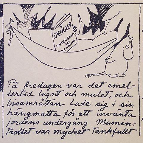 13 Ондатр — это тоже Атос Виртанен. Занудный, неуклюжий, презирающий суету и без конца бормочущий о тщетности всего сущего Ондатр воплощал все, что раздражало Туве Янссон в ее женихе. В очередной раз разозлившись на бытовую беспомощность Виртанена, Янссон впервые нарисовала Ондатра: пока весь Муми-дол искал спасения от кометы, он безмятежно лежал в гамаке и читал книгу. В повести «Комета прилетает» на книге было написано «Шпенглер», но впоследствии Янссон уточнила, что речь шла именно о «Закате Европы».