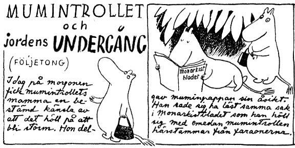 22 Из-за политических пристрастий Муми-папы Туве Янссон пришлось сменить издателя. Первые комиксы про муми-троллей выходили в газете Ny Tid, крупнейшем финском прокоммунистическом издании. Но в 1948 году подписчики завалили редакцию жалобами из-за того, что Муми-папа выписывал промонархистскую газету. Редакции пришлось разорвать контракт с Янссон.