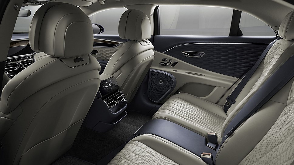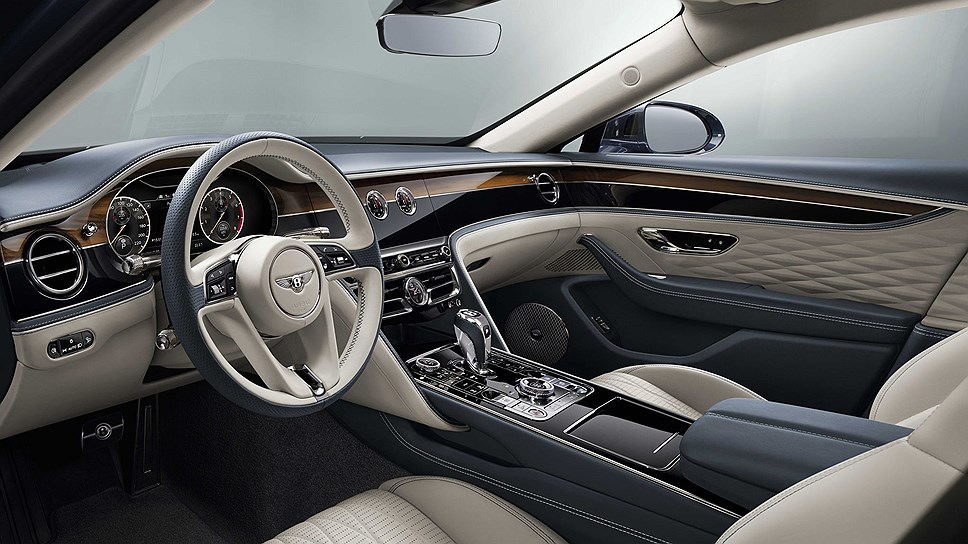 Колесная база модели увеличилась на 13 см, что сделало салон более просторным. На центральной консоли использован необычный трехсторонний элемент. При выключенном зажигании он повторяет рисунок декора передней панели, при заведенном двигателе секция разворачивается 12,3-дюймовым сенсорным экраном в салон, а на третьей грани, которую можно вызвать нажатием на клавишу, расположены аналоговые циферблаты термометра, компаса и часов. Особенностью седана стала трехмерная текстурированная кожаная обивка, разработанная специально для Bentley Flying Spur.