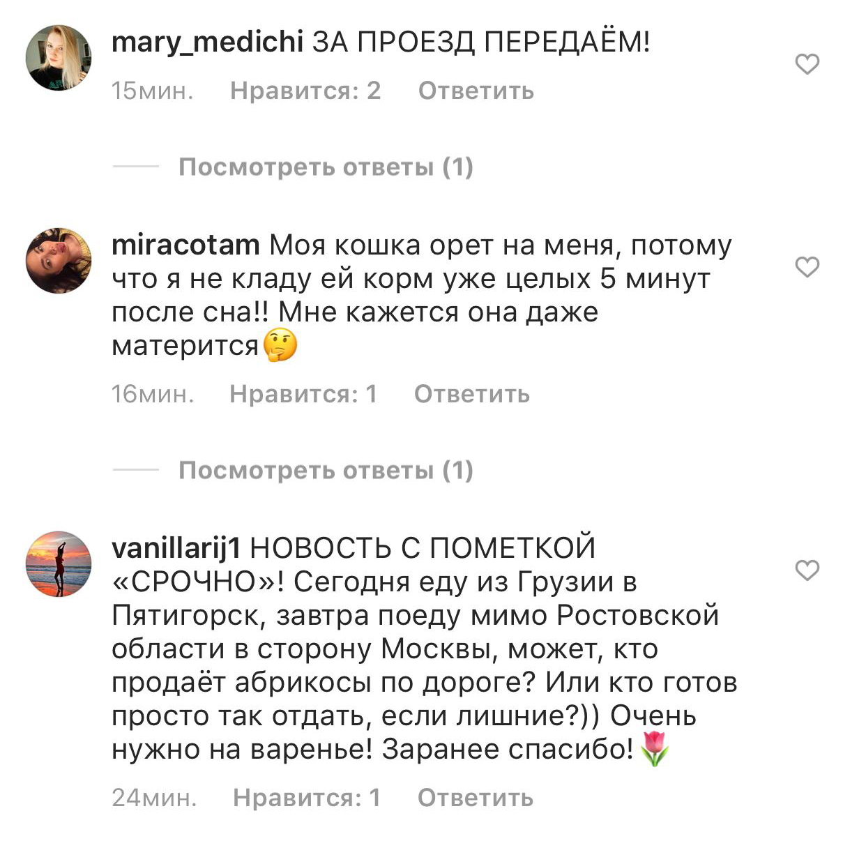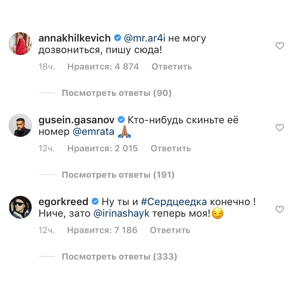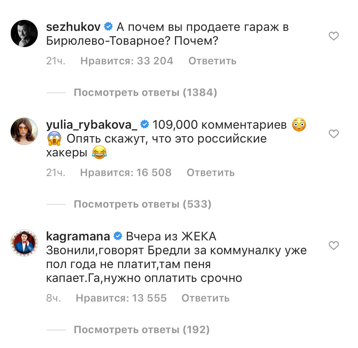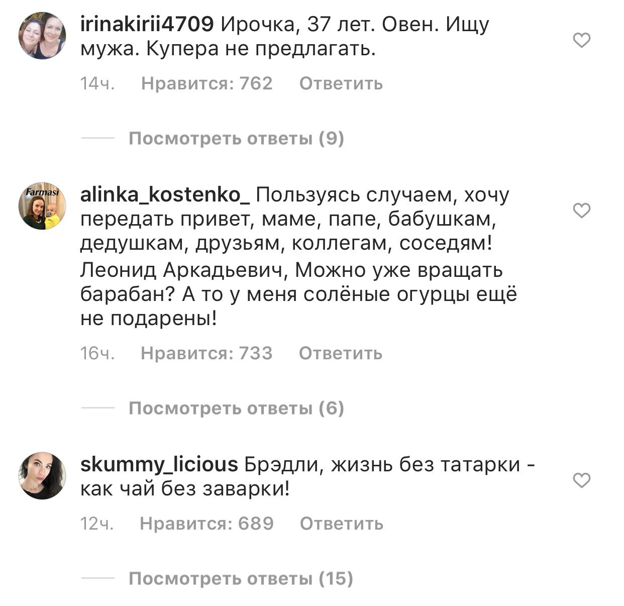 Если сначала большинство комментариев сводилось к призывам вернуть Ирине мужа, то сейчас это уже больше походит на какую-то очень странную разношерстную доску объявлений для россиян: Сергей Жуков спрашивает, сколько стоит гараж на Бирюлево-Товарной, представители малого бизнеса рекламируют монтаж пластиковых окон («Брэдли ставить не будем — а вам поставим»), жены напоминают мужьям купить хлеб в магазине — и все в таком духе.