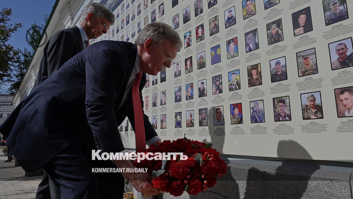 Помощник президента Трампа по нацбезопасности Джон Болтон возложил цветы к мемориалу украинским воинам, погибшим в боях с «сепаратистами», а позже от имени США выразил готовность «любым способом» присоединиться к усилиям по мирному урегулированию (на заднем плане — посол США на Украине Уильям Тейлор)
