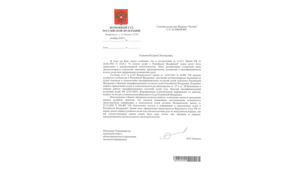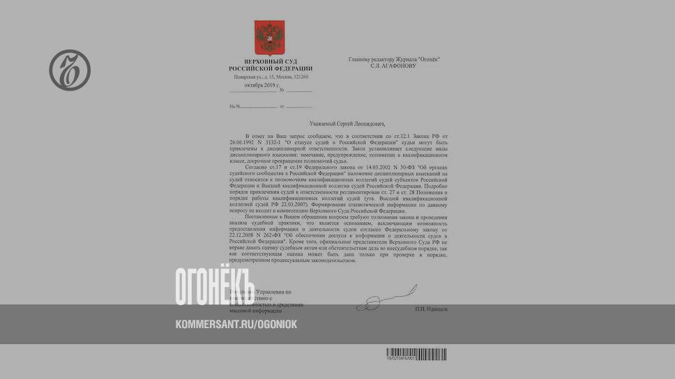 На минувшей неделе редакция получила официальный ответ Верховного суда. Публикуем его полностью и без комментариев — в них просто нет нужды: