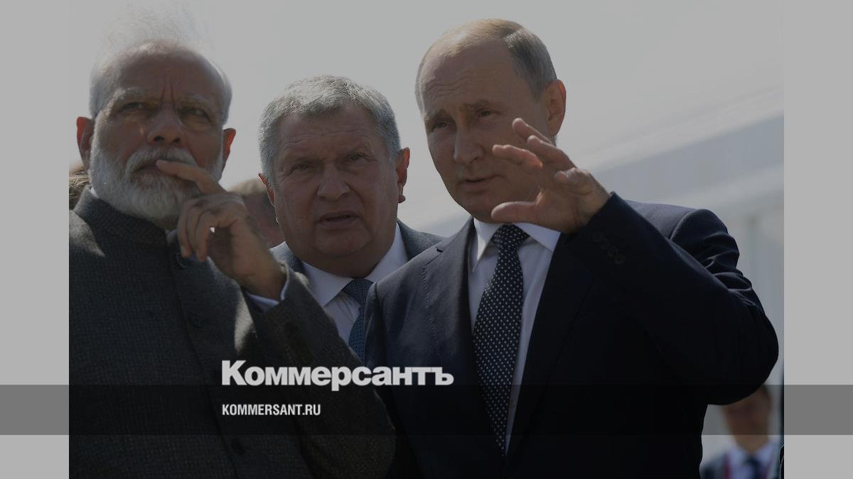 Слева направо: премьер-министр Индии Нарендра Моди, главный исполнительный директор, председатель правления ПАО «НК «Роснефть» Игорь Сечин, президент России Владимир Путин