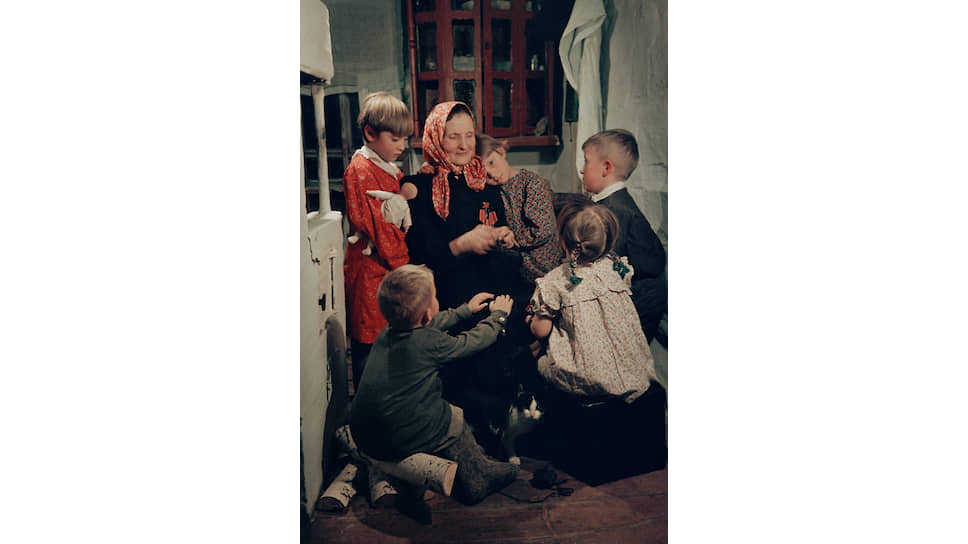 Герой Социалистического Труда, колхозница сельхозартели «Заветы Ильича» Канского района Красноярского края Ксения Васильевна Винокурова со своими внуками