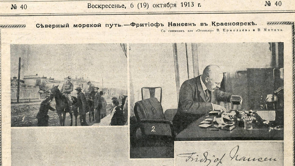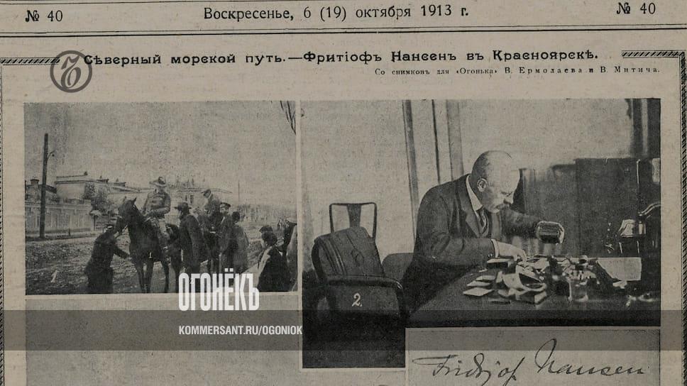 В Красноярске норвежского гостя встречали с пышной торжественностью. «Старинная мечта, не угасавшая со времен первых русских мореходов на Севере, близка к осуществлению»,— писал тогда «Огонек» (№40, 1913 год).— Нансен выступал с докладами о своих путешествиях, много ездил по окрестностям, переплавлялся на плашкоуте (судно с малой осадкой) на правый берег Енисея. Побывал и на "Соколовке" — так назывался первый красноярский стадион, построенный любителями, где в честь Нансена состоялся футбольный матч. На прощание гостю подарили альбом фотоснимков с надписью: "Фритьофу Нансену Красноярский музей"».