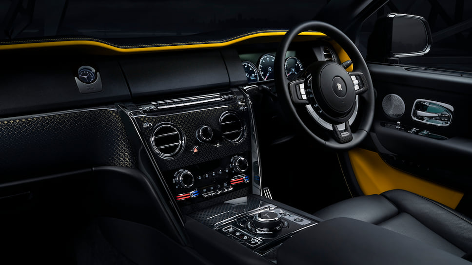 Особенностью салона Cullinan Black Badge стала отделка шпона углепластиком с алюминиевым волокном — на создание узора из повторяющихся геометрических форм с трехмерным эффектом уходит 21 день. Интерьер можно отделать кожей цвета Forge Yellow — оттенок, недоступный ранее для автомобилей британской марки, дебютирует на новом кроссовере.