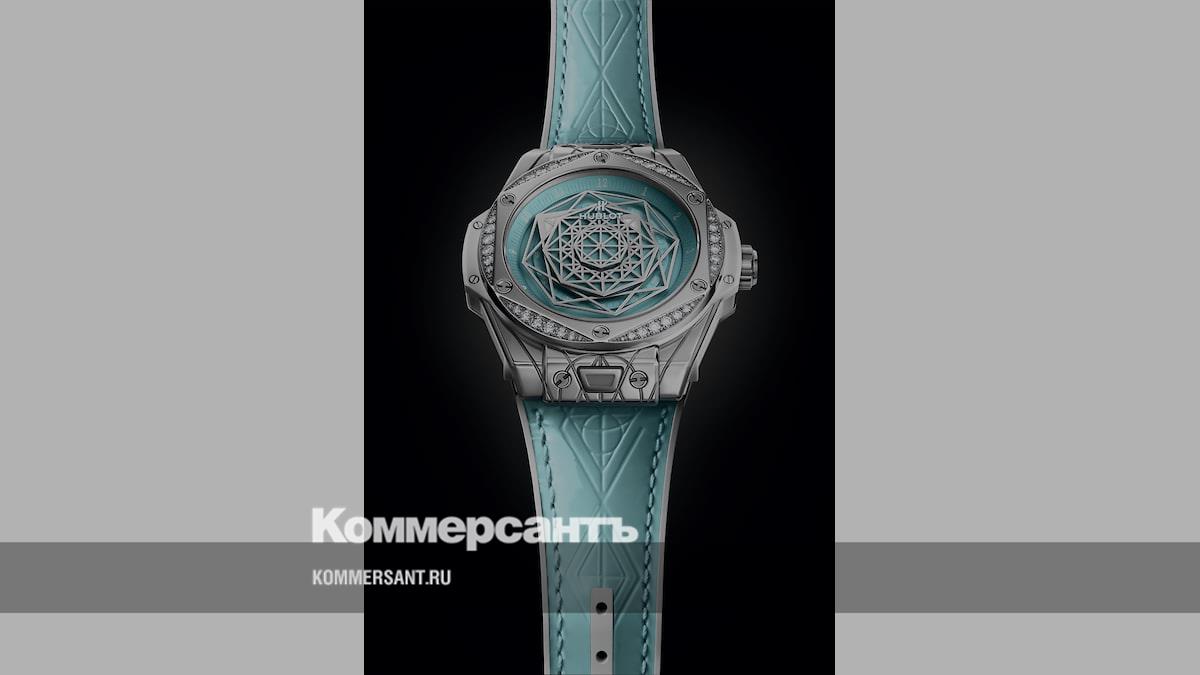 Для именных часов он выбрал новую систему указания времени. В круг циферблата вписаны несколько многоугольников, вращающихся с разной скоростью. Самый маленький и быстрый в центре показывает бег секунд. Второй вращается в минутном ритме, третий обходит цифры с обозначением часов от 1 до 12. Корпус из полированной стали диаметром 39 мм и толщиной 12,55 мм не так велик, как у мужского варианта Big Bang, зато кольцо украшено 48 бриллиантами. Под прозрачной задней крышкой с сапфировым стеклом — мануфактурный механизм-автомат HUB1710. У часов есть система смены ремешка One Click, которая позволяет легко и безо всяких инструментов заменить белый каучуковый пляжный на белый кожаный или бирюзовый кожаный ремешок. Новая модель для русского рынка имеет циферблат цвета бирюзы. Это и есть One Click Sang Bleu Steel Turquoise.