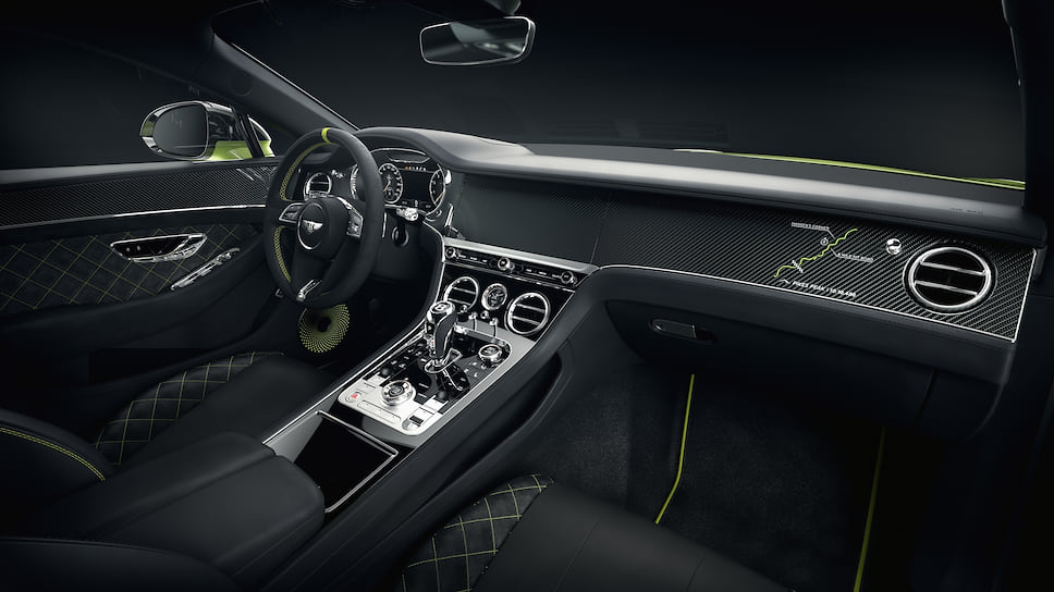 Салон получил отделку черной алькантарой с контрастной прострочкой Radium, декоративные панели из углепластика. Со стороны пассажира изображена схема трассы на Пайкс-Пик с указанием рекордного результата Bentley Continental GT. Также купе отличается вышитыми логотипами гонки на креслах, особыми накладками на пороги и динамики акустической системы.