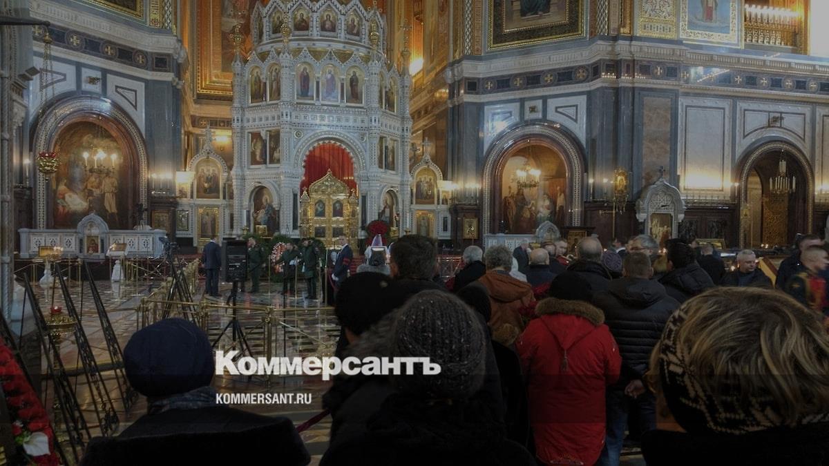 В самом храме работают военные. Гроб с покойным стоит по центру главного зала. Гроб закрытый. Он покрыт флагом России. Людей небольшими группами пропускают по правую руку от покойного. С левой стороны — места для родных и близких. За гробом расставлены венки, в том числе от администрации президента.