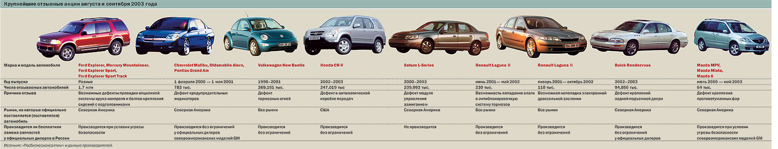 Иногда дефект выявляется в процессе заводских испытаний машины, но чаще об отзывах объявляют после изучения статистики гарантийного ремонта. Еще несколько лет назад посылом для отзыва могла стать не только инициатива производителя, но и коллективный судебный иск клиентов. Сейчас о таких случаях не слышно — компании предпочитают не доводить дело до публичных разбирательств, которые вне зависимости от исхода могут серьезно подмочить репутацию марки. Более того, в последнее время наблюдается противоположная тенденция. "Производитель настолько трепетно относится к качеству своей продукции, что отзывает машины по каждому поводу",— говорит Тараканов. А сам факт отзыва преподносится как проявление заботы о клиенте. "Мы исправляем не дефект, мы исправляем риск дефекта",— подчеркивает Ян Доризон, пресс-секретарь СП "Автофрамос", генерального импортера Renault. Именно поэтому, объявляя об отзыве, компании чаще всего сообщают, что "ни одной аварии из-за данного дефекта не произошло".